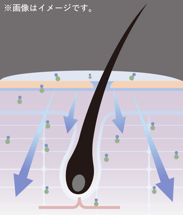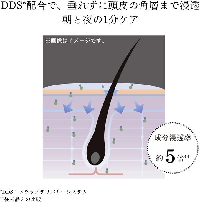 それらを、独自の最新浸透技術(ドラッグデリバリーシステム: DDS)と組み合わせることで、従来の技術では浸透しづらかった水溶性育毛成分を効果的に角質層まで浸透させることを実現したスカルプエッセンスで、朝夜1日2回、頭皮全体に数プッシュするだけで効果を発揮します。