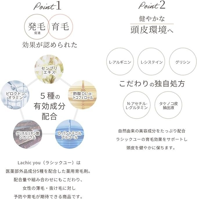 本製品は、医・薬・毛髪の専門家と共同開発した、発毛促進効果が示されている医薬部外品5成分、毛髪を作るアミノ酸5種以上をバランスよく配合し、育毛にアプローチできるよう成分設計しています。