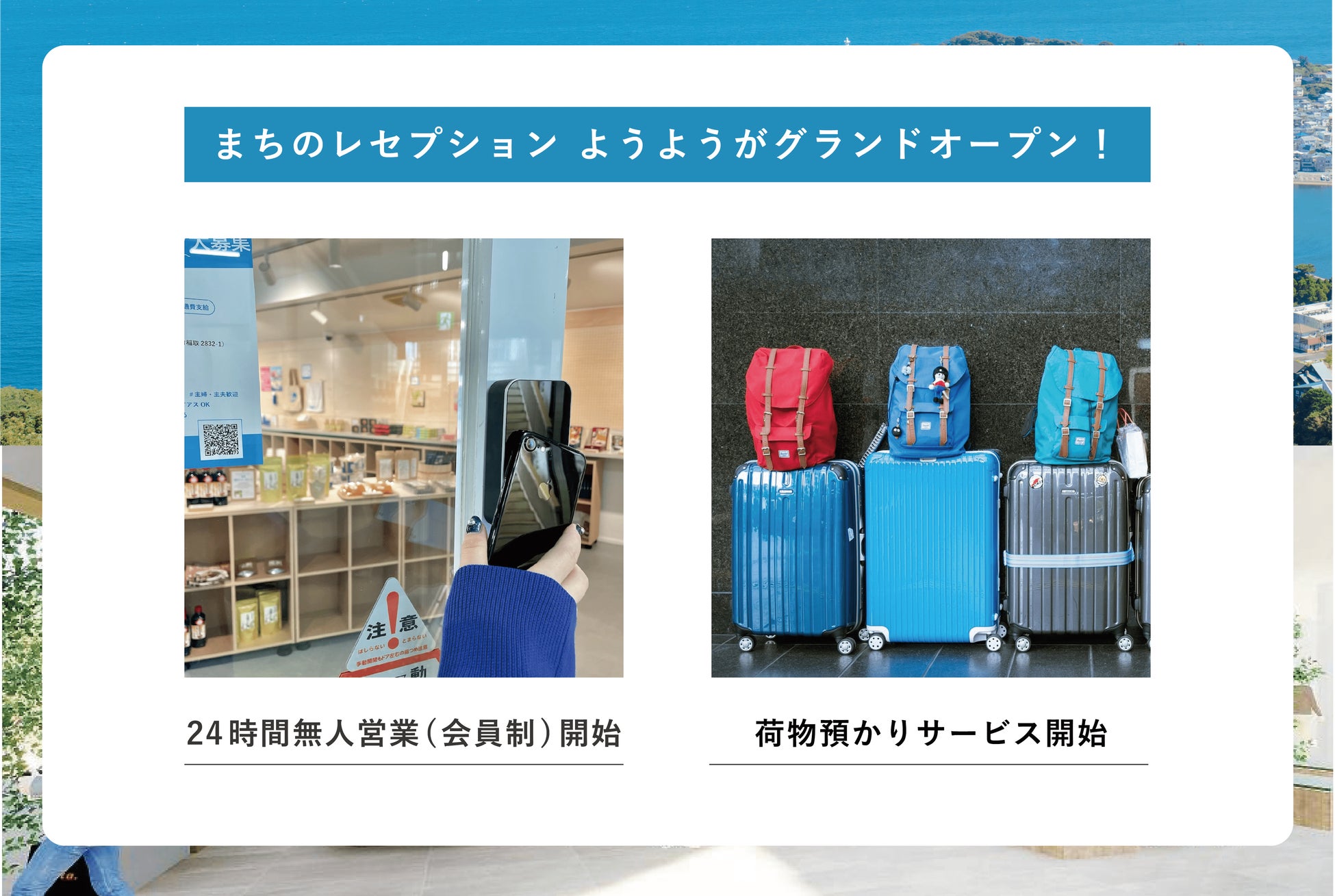 24時間営業の開始に加え、観光・滞在に便利な荷物預かりサービスやキャッシュレス決済も導入。まちあるきのお供にぴったりな開業記念オリジナルグッズも発売。