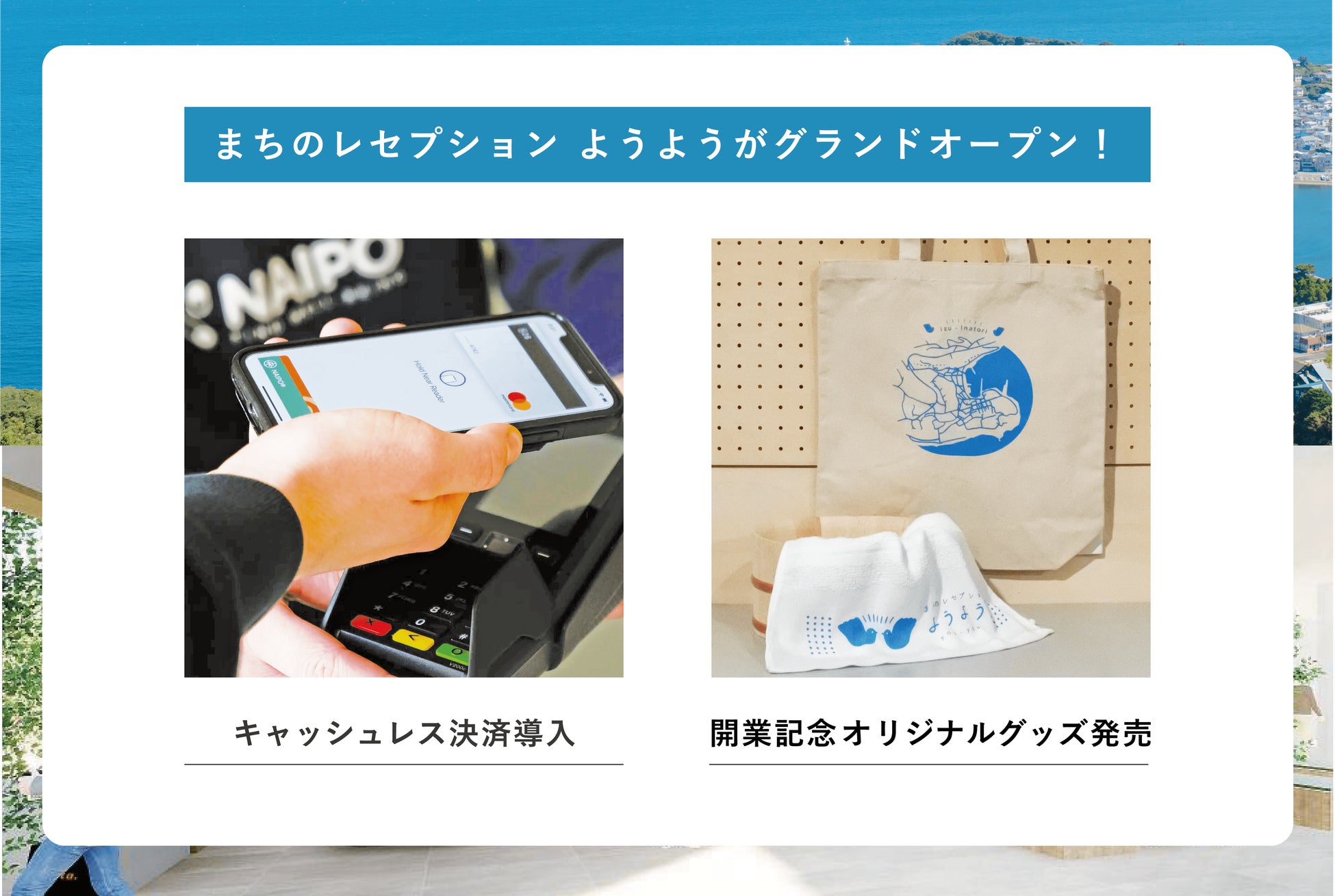 まちあるきに便利なトートバッグとタオルをセットにした開業記念オリジナルグッズを発売いたします。お土産や飲み物などがしっかり入るトートバッグは、クラウドファンディング支援者やSNSのフォロワーのみなさまからデザイン案などのご意見をいただきながら一緒につくりました。まちあるきのお供にも、旅の記念にもぴったりな「ようよう」グッズとなっています。