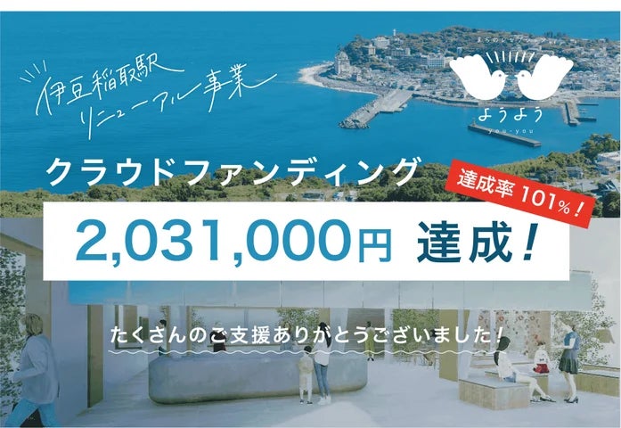 伊豆稲取駅リニューアルプロジェクトとして、観光客も地元住民も一緒に「手を振り合う風景」をつくるためにクラウドファンディングを実施。終了時には、総勢184名の支援者の方々から総額2,031,000円(目標金額の101%)のご支援をいただきました。