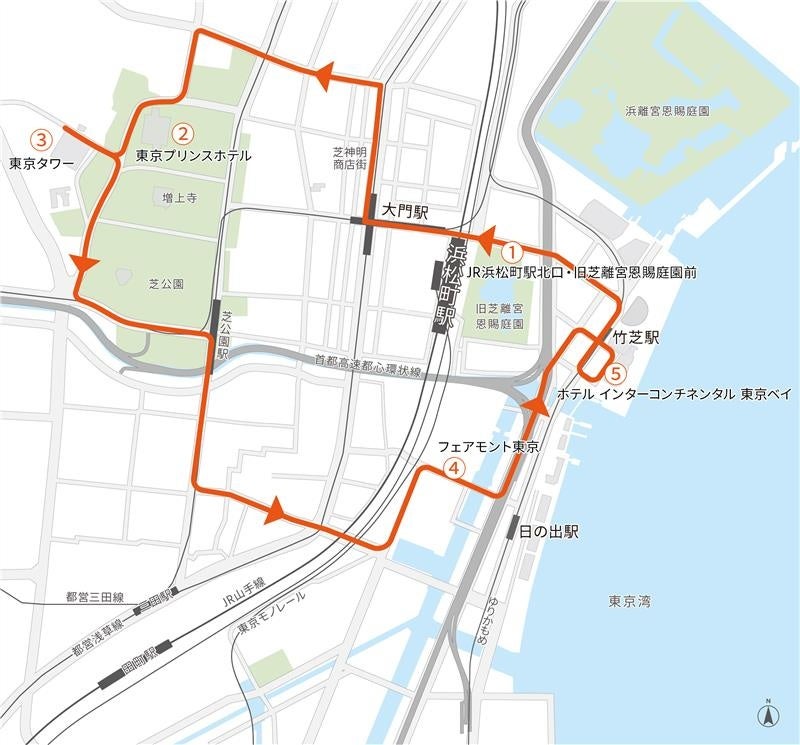 運行ルート:JR浜松町駅北口・旧芝離宮恩賜庭園前 → 東京プリンスホテル → 東京タワー → フェアモント東京 → ホテル インターコンチネンタル 東京ベイ(循環)