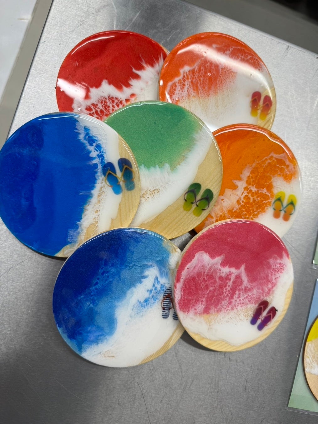 沖縄の海をモチーフにしたデザインに、当店のロゴやビーチサンダルが施されています。他にもキーホルダーや時計等、世界に一つしかない可愛いアイテムが盛り沢山!