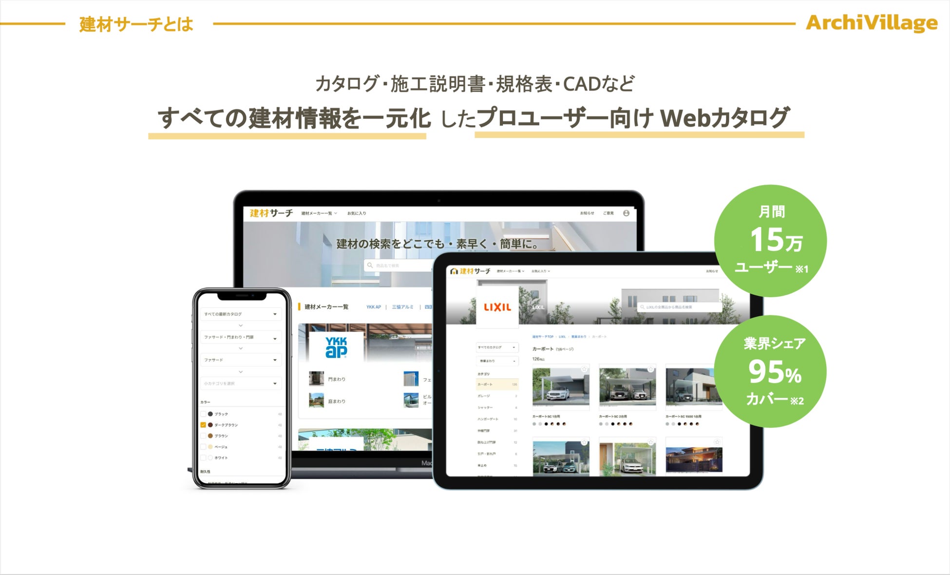 「建材サーチ」は、カタログ・施工説明書・規格表・CADなどすべての建材情報を一元化したプロユーザー向けWebカタログです。