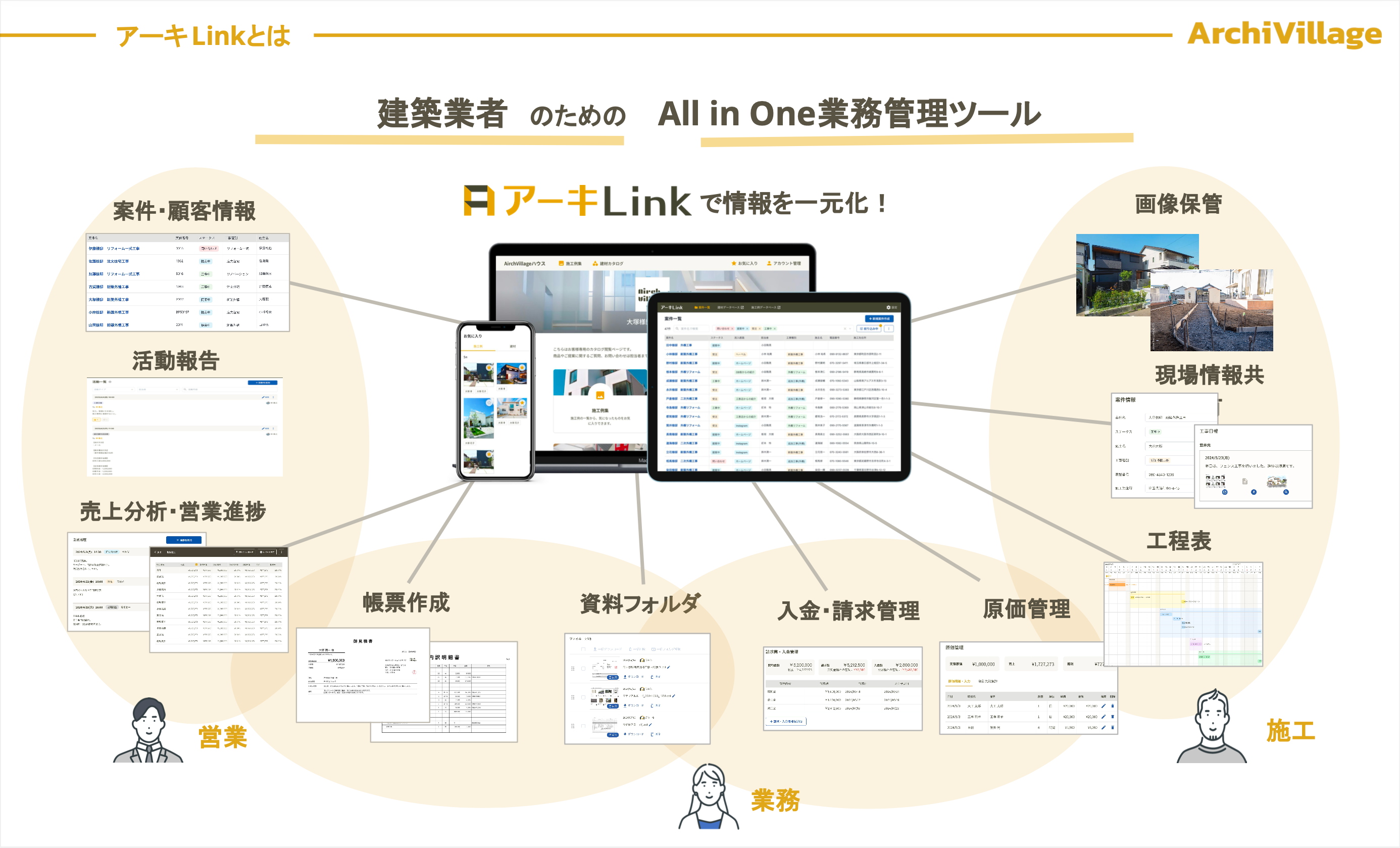 「アーキLink」は、建築業特化のオールインワン業務管理ツールです。 案件情報管理・ファイル保管・帳票作成・分析集計など、すべての業務をアーキLinkに一元化。