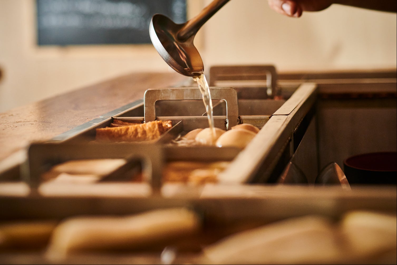 「出汁と旬食材をこだわればおでんは365日美味い」がコンセプトで自慢の究極の鱧出汁は様々な食材を活かし食材の旨味と融合し『出汁までおいしく飲めるおでん』に仕上げています。 こだわりの卓上の薬味 (特製濡れ一味、柚子胡椒、辛子、ハリッサ)、 お通し代わりに提供するオリジナル薬味 ( ねぎ醤油と山わさび ) やトッピングのブルーチーズやジェノベーゼなどでここにしかない“カスタマイズおでん”の楽しみ方を演出しています
