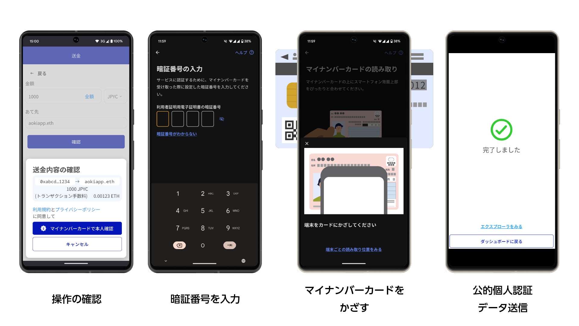 「AokiAppウォレット」は、ユーザーがマイナンバーカードを使用して暗号資産を送受信できる暗号資産管理ソリューションです。マイナンバーカードを用いた認証により、従来のパスワードや秘密鍵の管理からユーザーを解放し、マイナンバーカードの強固なセキュリティによって安心して暗号資産を管理することができ、マイナンバーカードだけで、ETH、JPYC Prepaid、非代替性トークン(NFT)などの暗号資産(※1)を管理できます。デジタル庁が提供するサービス「デジタル認証アプリ」を活用し、公的個人認証法を順守した手順でマイナンバーカードによる認証を行い、認証を行ったときにのみ暗号資産を送受信できます。
