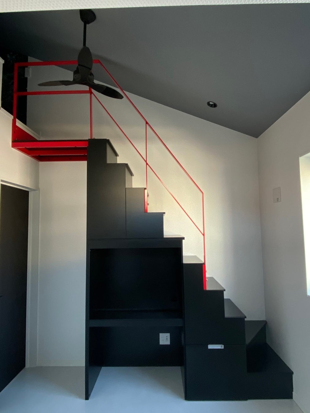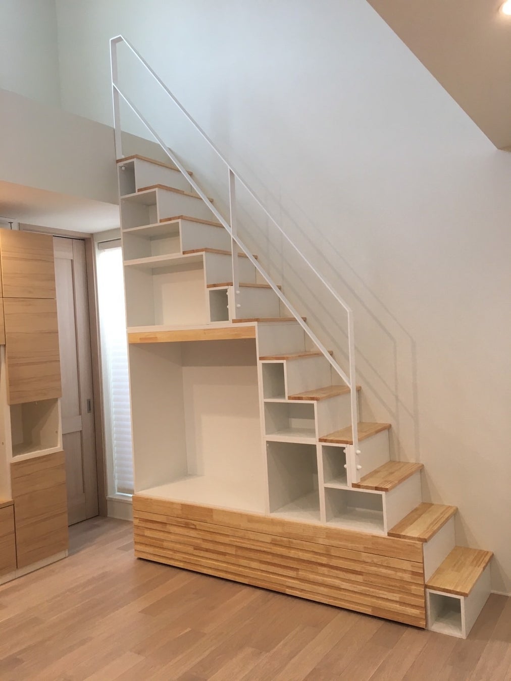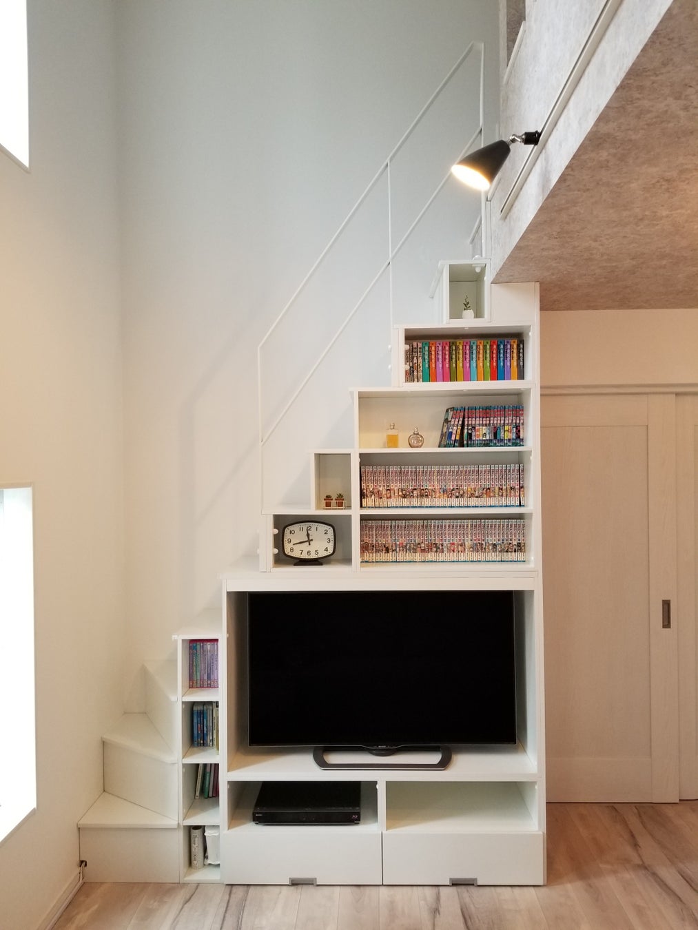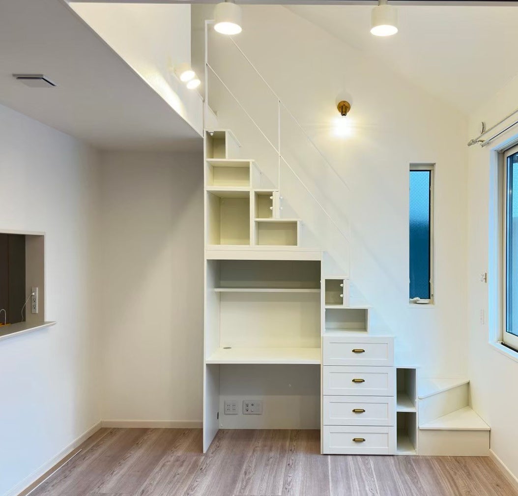 Escaloを間口が狭い部屋用にカスタマイズしました。はしごの場合はデッドスペースとなっていた空間を有効に活用し、収納力もアップしました。お部屋がスッキリと整理され、快適な居住空間を実現しています。