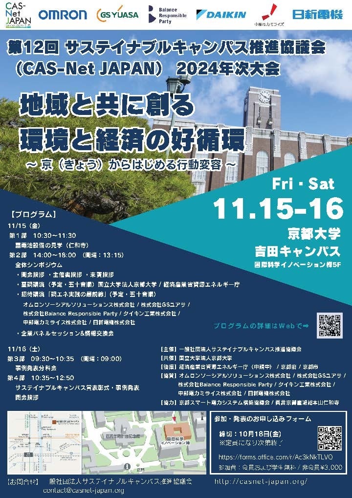 第12回 サステイナブルキャンパス推進協議会(CAS-Net JAPAN) 2024年次大会 「地域と共に創る、環境と経済の好循環:京(きょう)からはじめる行動変容」