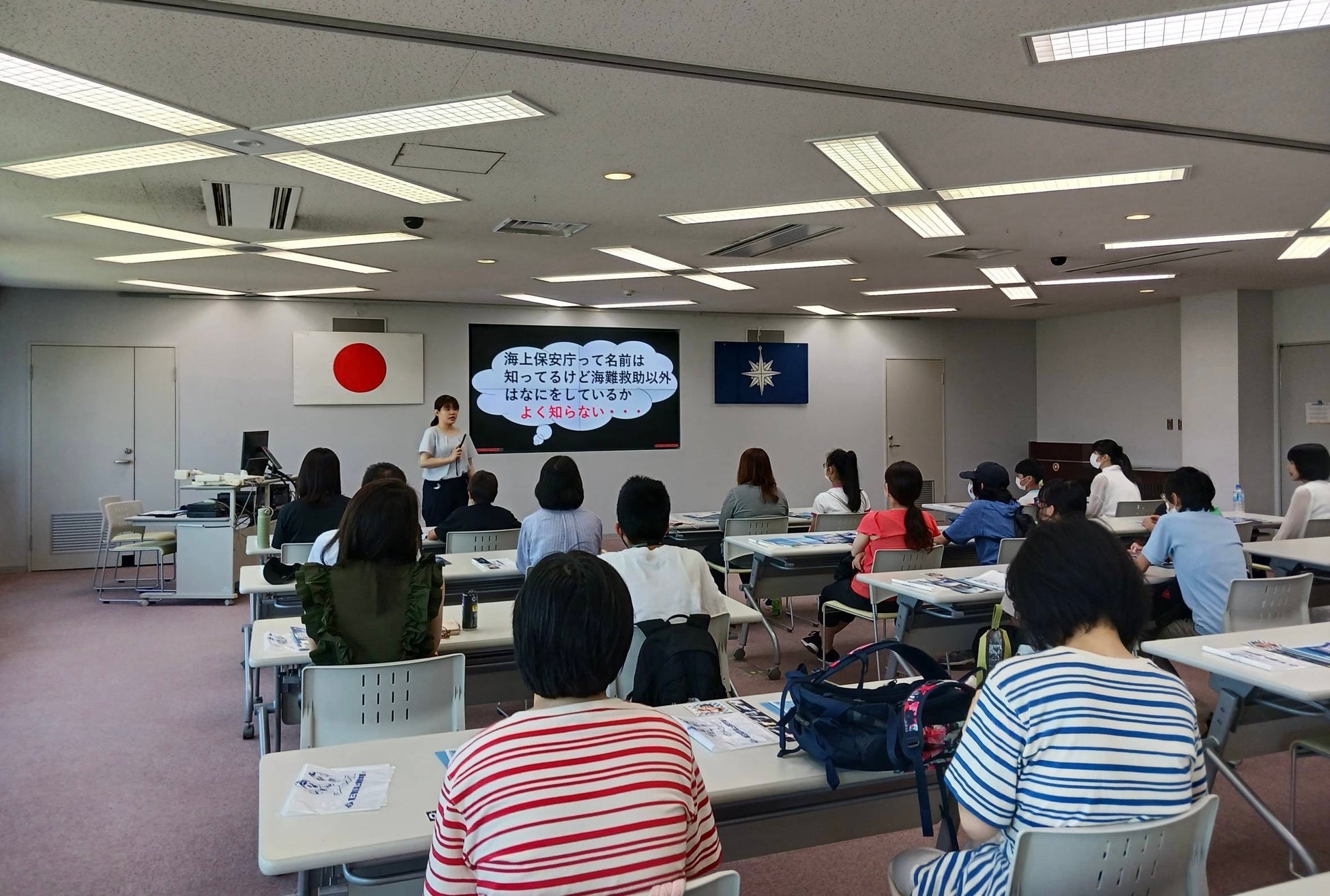 内容:業務説明、防災基地見学、大型船停泊していればその前で写真撮影、ミニ制服の着用体験、資料館見学