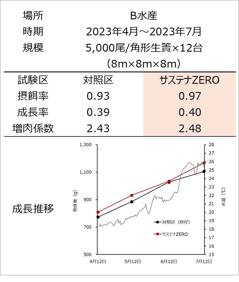 【表】「サステナZERO」は従来の魚粉を配合した飼料と同等の成績を実現