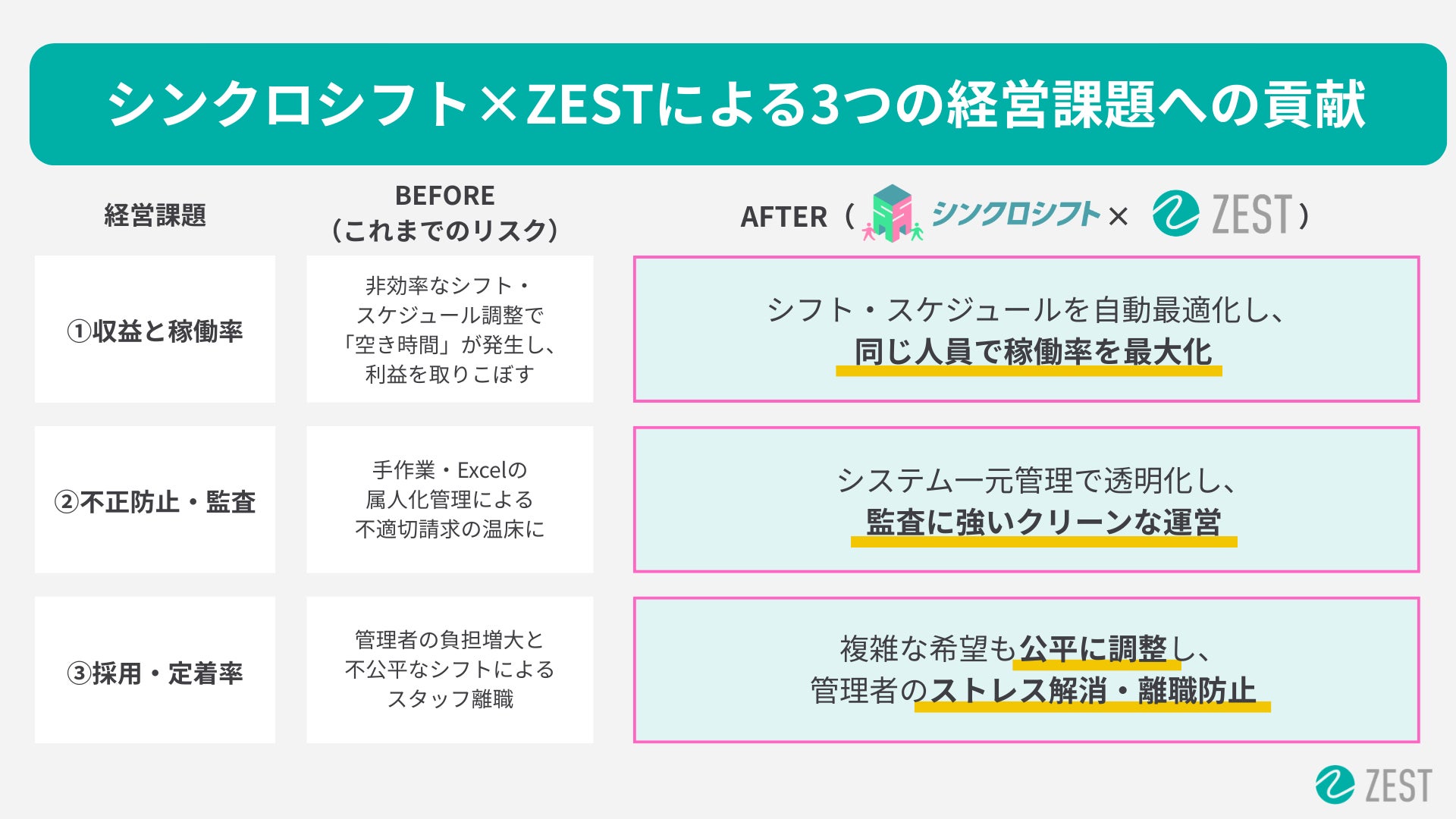 【施設経営者・管理者必見】ZEST×シンクロシフト連携開始「スタッフの希望を叶えるシフト」が「不正を防ぎ、利益を最大化する」経営戦略に変わる