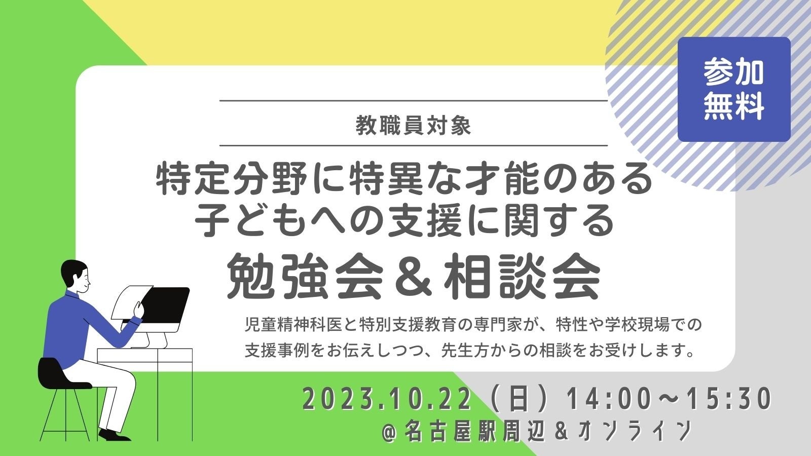 この度、10月22日に、名古屋駅周辺の会場にて、教職員向けの勉強会・相談会を開催します。当勉強会の愛知県内での開催は初の機会となります。オンラインでの同時配信も行うため、全国からご参加可能です。