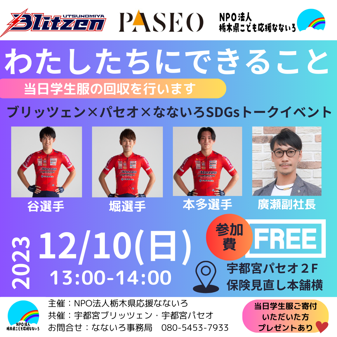 特定非営利活動法人栃木県こども応援なないろ(事務局:栃木県宇都宮市、理事長:皆川純子、以下「なないろ」)は、こどもの食・学生服・居場所支援の取り組みをおこなっています。宇都宮ブリッツェン選手などをゲストにお迎えし「わたしたちにできること」をテーマとしたトークイベントを開催いたします。