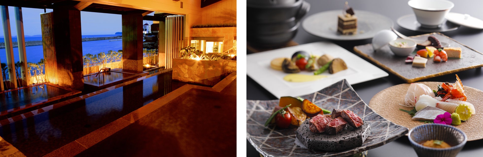 大阪・神戸など関西主要都市の拠点からのアクセスが抜群で、手軽に非日常を味わえる関西近郊のリゾート地として近年ますます注目を集める兵庫県·淡路島洲本温泉。洲本市三熊山の麓から湧出する温泉「洲本温泉うるおいの湯」は、柔らかな肌触りが特徴的で保温・保湿効果も高く、疲労回復や冷え性、腰痛や神経痛などへの効果が期待できます。大浜海岸や古茂江海岸など、淡路島随一の景勝地として知られる東海岸に沿って点在する洲本温泉の旅館やホテルでは、開放感抜群の露天風呂などで美しい紀淡海峡のパノラマを一望しながら温泉を満喫することが出来ます。また、古来から京の朝廷に多くの食材を献上していたことから「御食国」と称されたほどの豊かで新鮮な魚介類や地元野菜、淡路牛などの食材をふんだんに散りばめた四季折々の料理を堪能できます。