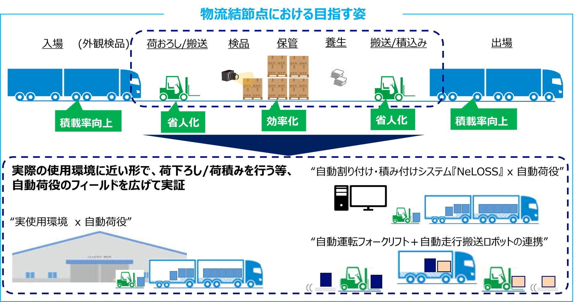 NEXT Logistics Japan 株式会社(本社:東京都新宿区、社長:梅村幸生、以下 NLJ)は、経済産業省が実施する令和 5 年度「無人自動運転等のCASE※1対応に向けた実証・支援事業(物流MaaS※2の実現に向けた研究開発・実証事業)」の実施団体に選出され、株式会社アイシン(本社:愛知県刈谷市、社長:吉田守孝、以下 アイシン)および株式会社豊田自動織機(本社:愛知県刈谷市、社長:伊藤浩一、以下 豊田自動織機)と協働し、将来の自動クロスドック(結節点)運用に向けた自動荷役技術ならびに荷物管理の一元化についてシステム開発や課題の抽出を行います。