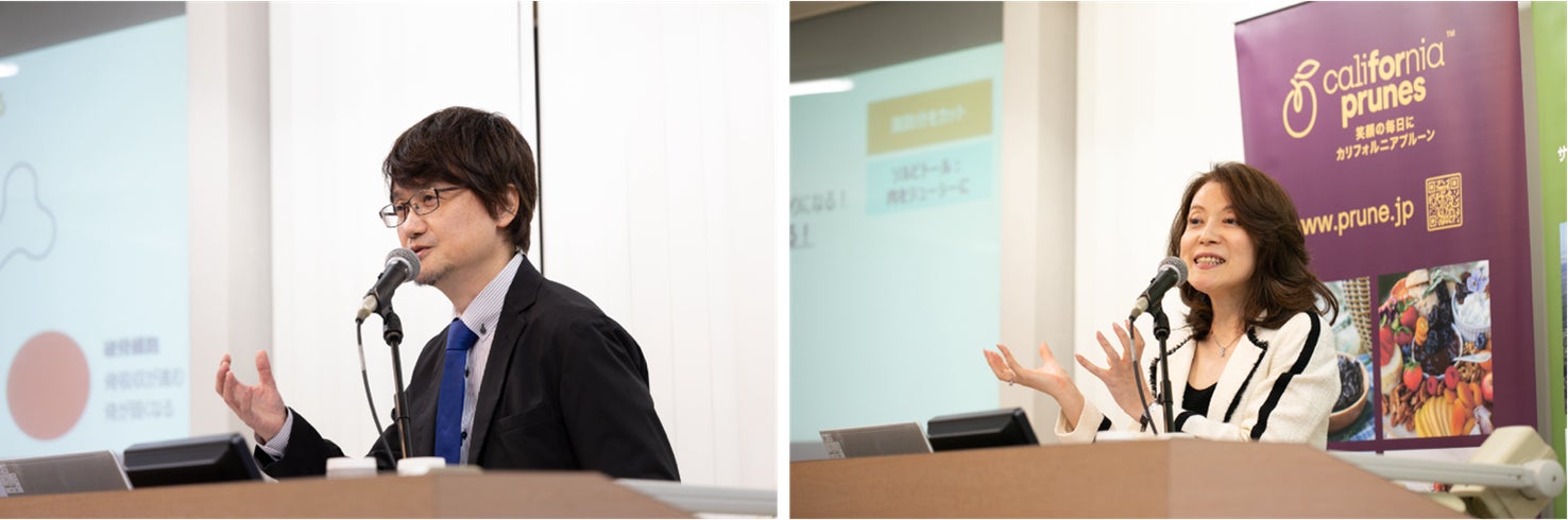 本セミナーでは、文教大学健康栄養学部管理栄養学科 教授 笠岡誠一(かさおか せいいち) 先生による「骨の健康を保つために ~プルーンの効果~」、戸板女子短期大学食物栄養科 管理栄養士 伊達友美(だて ゆみ) 先生による「骨活&フェムケアの秘策!プルーン活用法 ジューシーなうまみをプラスして、女性ホルモンをサポート」について、プルーンの成分を紐解きながら日常的にプルーンを摂取するメリットや摂取方法についてご説明いただきました。