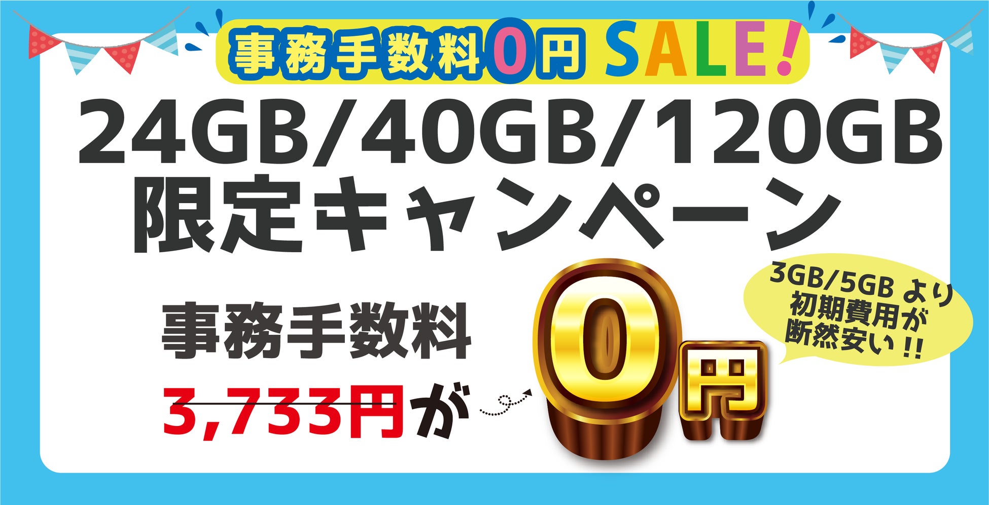 キャンペーン実施期間中、お申し込み時に「かけ放題付き24GB・40GB・120GBプラン」をお選びいただくと、なんと初期費用で通常3,733円かかる事務手数料が0 円でお得にご契約いただけます。