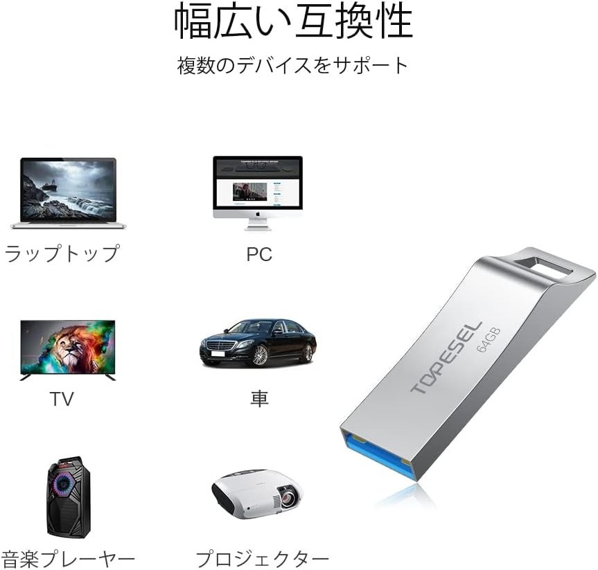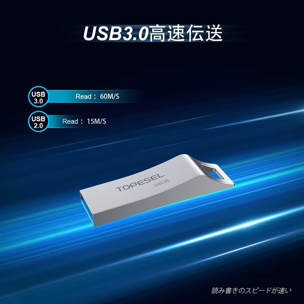 USBメモリ64GB USB3.0 TOPESEL フラッシュドライブ 小型 防水 防塵 耐衝撃 USBフラッシュメモリ 金属ボディ データ高速転送 Windows PCに対応(シルバー)