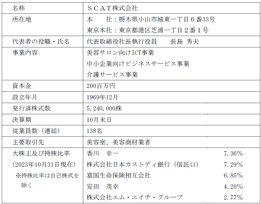 当社グループでは、美容室支援事業においての新たな取り組みとして理美容業界向けBtoBクレジット決済サービスに注力しております。日本国内においてもキャッシュレス決済の普及はより加速し、企業間のBtoBクレジット決済においてもそのニーズは高まっております。SCAT社の有するソリューション技術、ネットワークと相互協力を図ることで、BtoBクレジット決済サービスの促進に加え、理美容業界の環境経営推進、DX推進等、課題解決の一助となるコンテンツ開発及びサービス領域の拡大に取り組んでまいります。