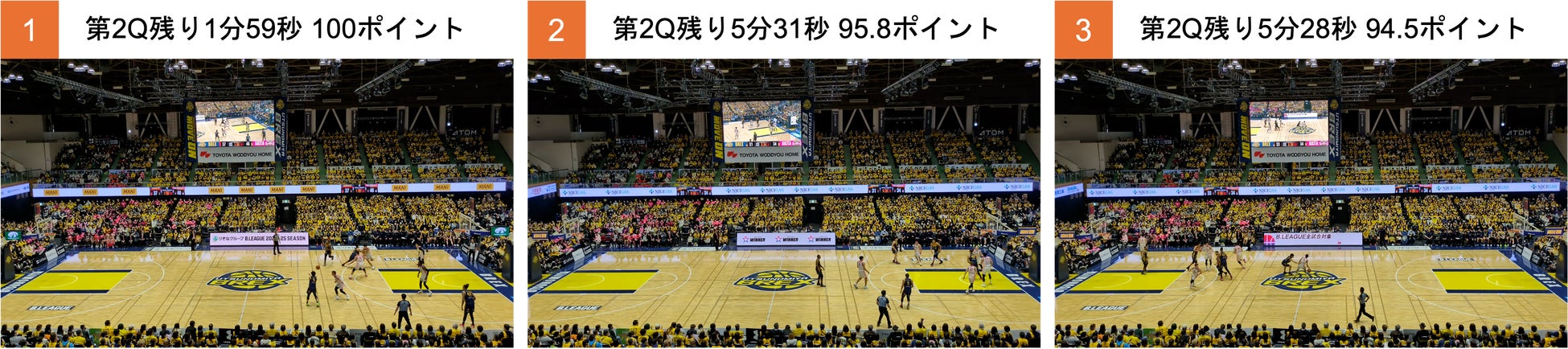 アリーナ環境下での良好な音声データの収録により,ボルテージ指数の計測を行い,観客の声援を元にした場内の熱量の可視化を実現しました。最も盛り上がったのは、第2Q残り1分59秒の [1]オフェンス・シーン、2番目は第2Q残り5分31秒のゴール・シーン、3番目は2番目のゴールシーンの直後で第2Q残り5分28秒のディフェンス・シーンとなりました。