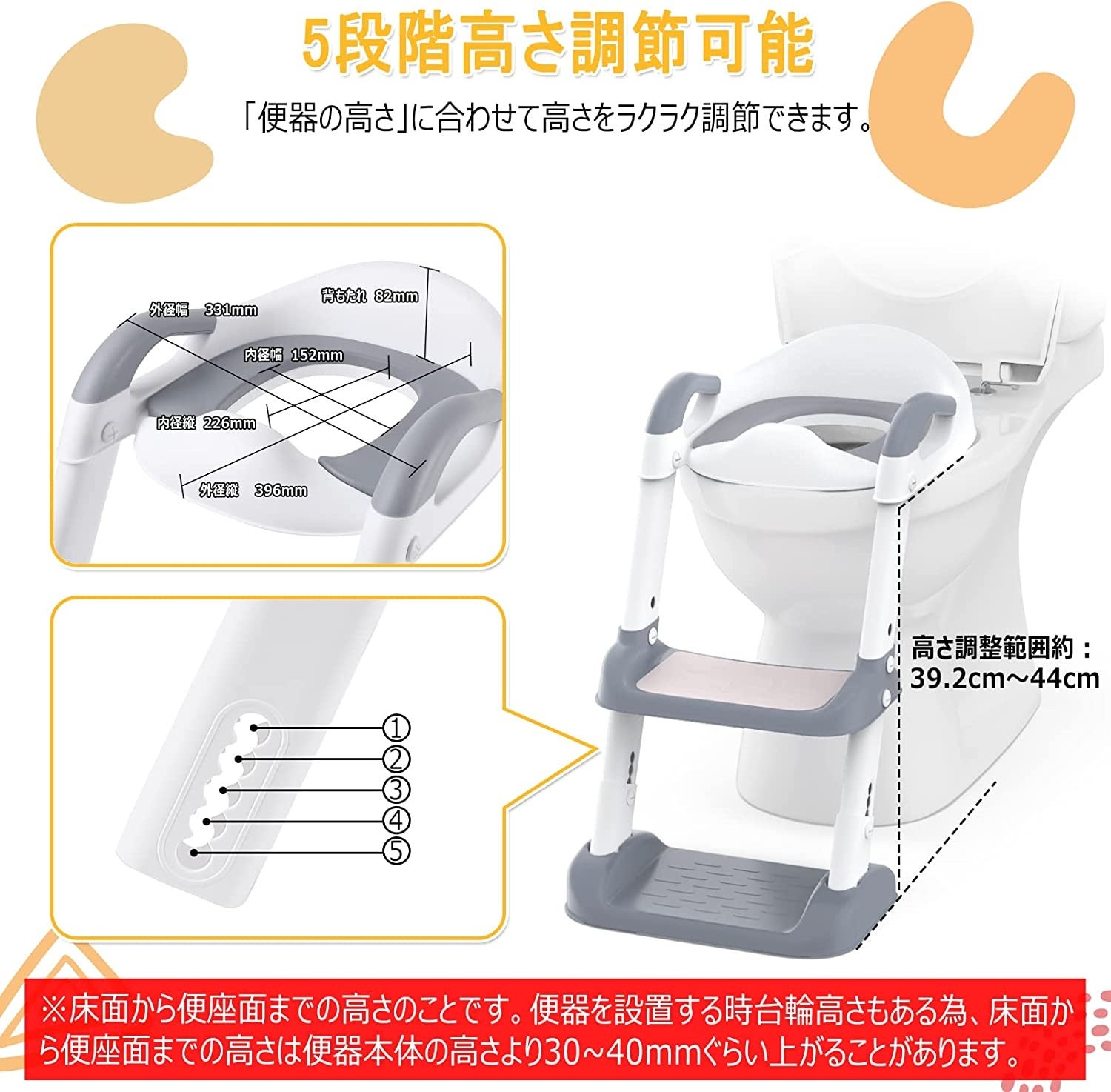 取り付け可能な大人用の便座は高さ39.2〜44cmです。