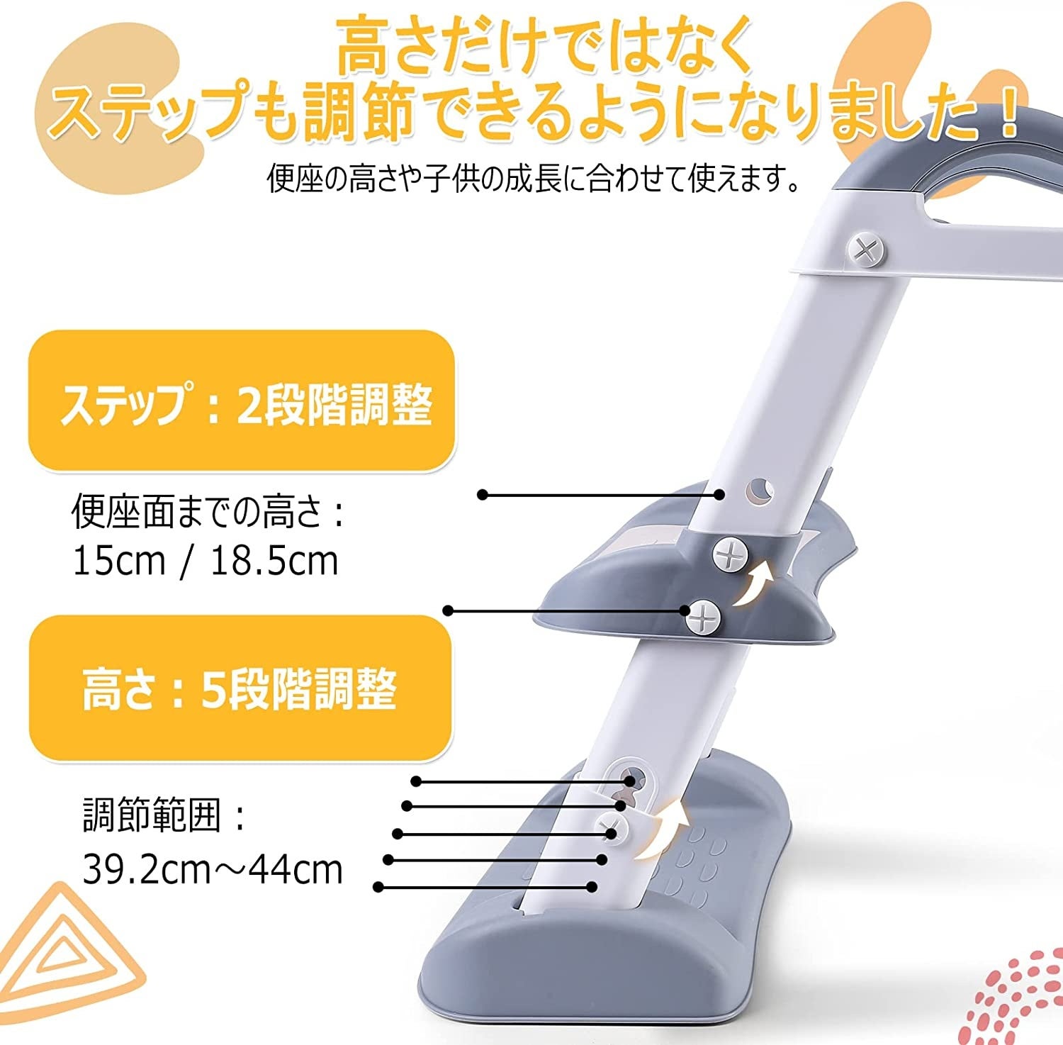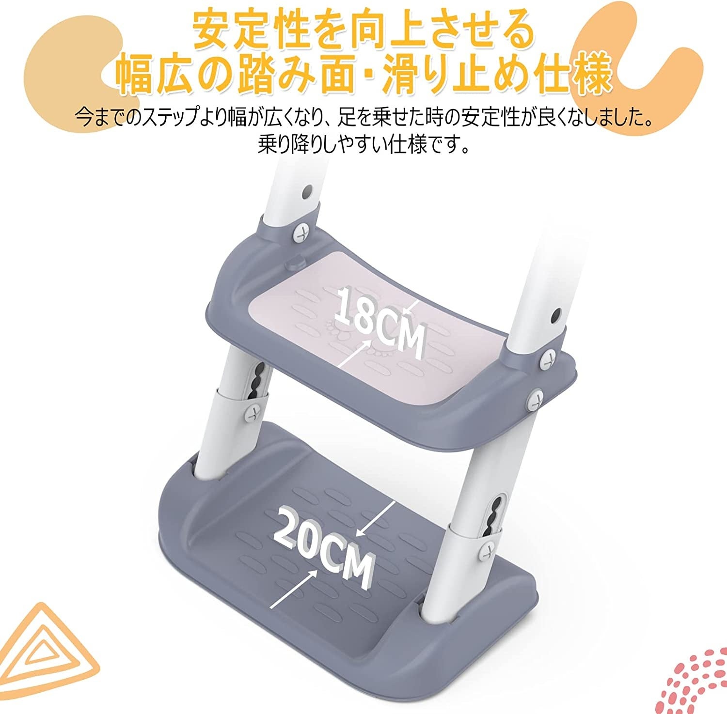 ステップの高さ2段階調整可能で、お子様の身長に合わせて変えられる仕様になりました。足が浮かないから、より快適に座れます。