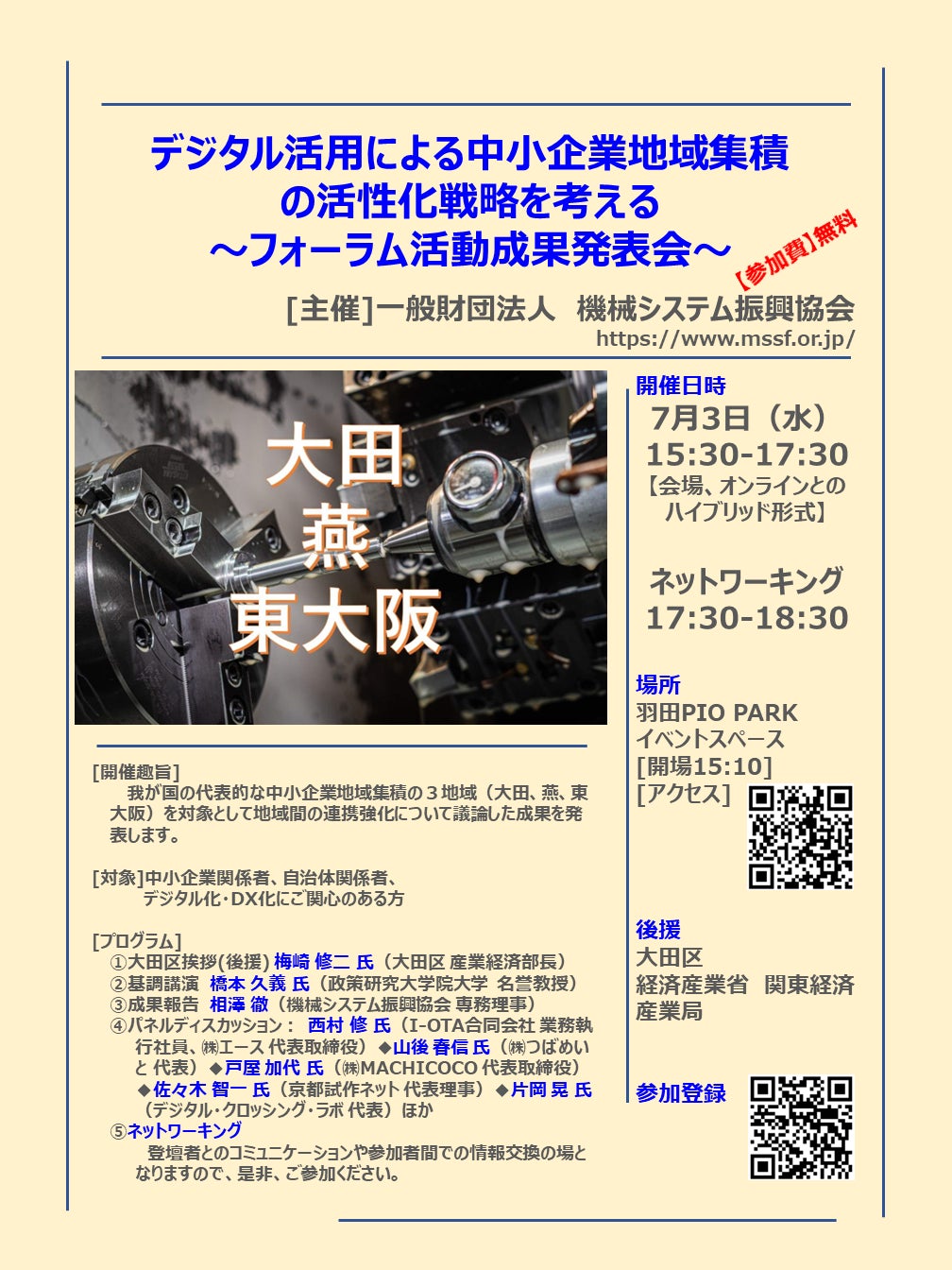 デジタル活用による中小企業地域集積の活性化戦略を考える【フォーラム活動成果発表会】7月3日(水)15:30■会場 羽田PIO PARK とオンライン開催■後援:大田区、経済産業省 関東経済産業局