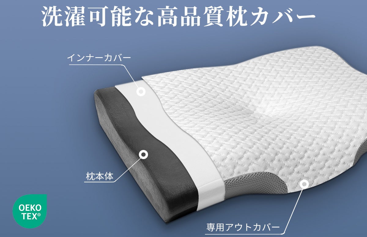 枕カバーには滑らかで肌触りの良い高品質な素材を使用し、繊細な仕上げで快適な使用感を提供します。インナーカバーと専用のアウトカバーが付属しており、洗濯が可能なため清潔に保つことができます。