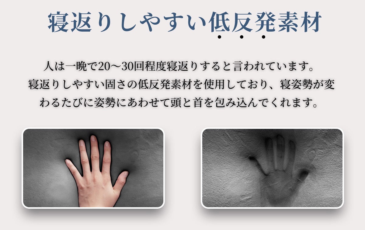 人は一晩に20~30回程度寝返りを打つと言われています。「低反発枕」は、寝返りのしやすさを追求した適度な固さの低反発素材を採用。寝姿勢に合わせて頭と首を優しく包み込み、快適な寝返りをサポートします。また、ウレタンフォームの密度が40Dを超えることで、製品の耐久性も高まり、8年以上の長期使用が期待できます。