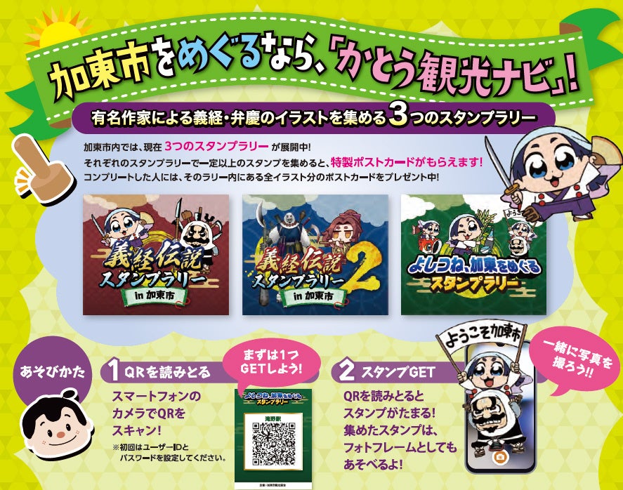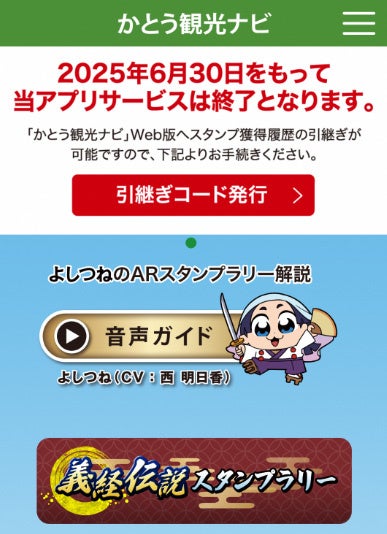 加東市の観光用アプリ『かとう観光ナビ』がWeb版へと移行しました。併せて『義経伝説スタンプラリー』シリーズもWeb版に移行します。