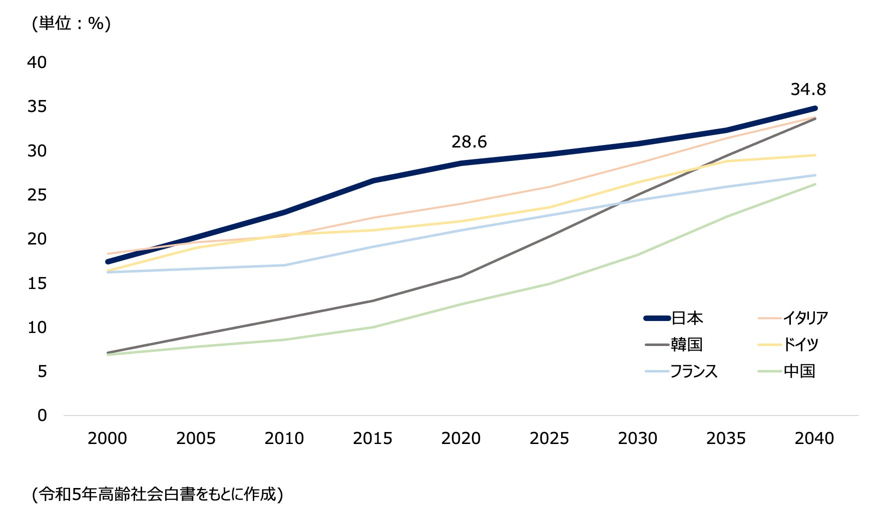 現在、日本は世界で最も高齢化率の高い国です。内閣府の「令和5年版高齢社会白書」のデータによると、2020年の高齢化率は28.6%、2040年には34.8%にまで達すると予測されています(図1)。これは15年後に国民の約3人に1人が高齢者になるということを意味しており、高齢化対策は国において喫緊の課題であると言えます。