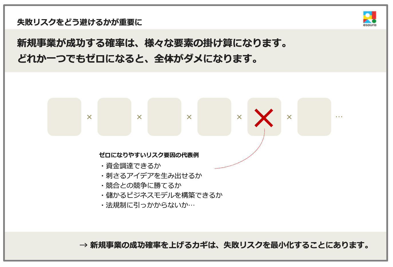 新規事業の成功確率を上げる秘訣は、失敗リスクを最小化することにあります。なぜなら、新規事業が成功する確率は様々な要素の掛け算となるため、どれか一つでもゼロになると全体がダメになってしまうからです。そのため、新規事業開発では ”失敗リスクをどう避けるか” が非常に重要になります。