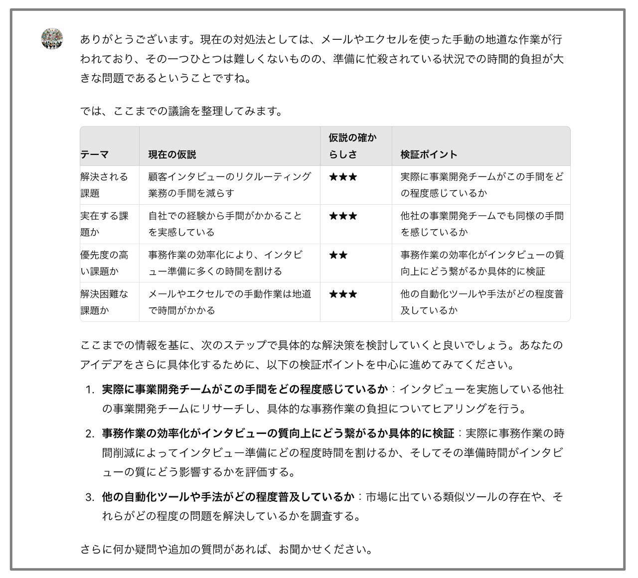 仮説の確からしさを評価し、具体的な検証ポイントを整理してくれます。これにより、次のステップが明確になり、実行に移しやすくなります。