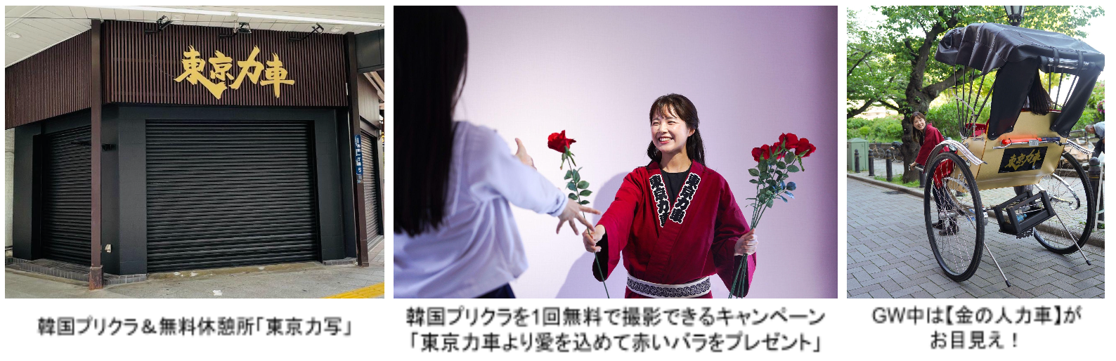当スポットのオープンを記念して、観光人力車「東京力車」では、「東京力車より愛を込めて 赤いバラをプレゼント」と銘打ち、ゴールデンウィーク期間中【4月27日(土)〜5月6日(月・ 祝)】に30分コース以上のプランでご乗車いただいたお客様、各日先着45名(期間合計450名) に 、当スポットの韓国プリント写真機を無料で1回体験できる赤いバラ(造花)をプレゼントい たします。