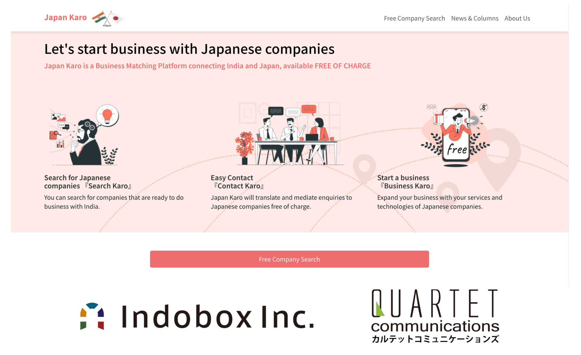 インドに特化し、産業、人材、教育など幅広い分野において日印連携を促進するIndobox株式会社(本社:愛知県名古屋市)と、インターネット広告専門代理店を主力とし、現在インドにもビジネス展開をする株式会社カルテットコミュニケーションズ(本社:愛知県名古屋市)は、日印のビジネス交流を加速させる支援型マッチングプラットフォーム「Japan Karo」を共同開発し、リリースいたします。