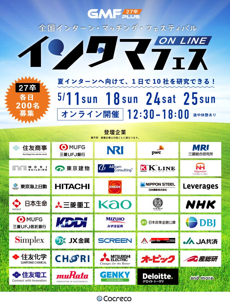株式会社コクリコ(本社:東京都新宿区、代表取締役:尾上友男)は、地方旧帝大・国立大生を中心に27卒就活生を動員し、企業41社が出展する採用イベント「全国インタマフェスonline」を5月に4回開催しました。