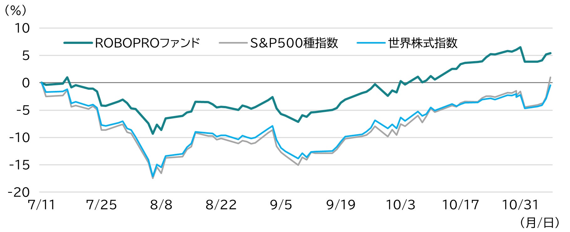 一方、ROBOPROファンドは、金や不動産に対する投資配分が高位だったことなどが奏功し、株式市場の下落の影響を小さく抑えることができました。ROBOPROファンドは、その後も堅調な戻りを見せており、10月3日には7月高値の水準を回復し、足元は7月高値を5.4%上回っています(11月7日時点)。