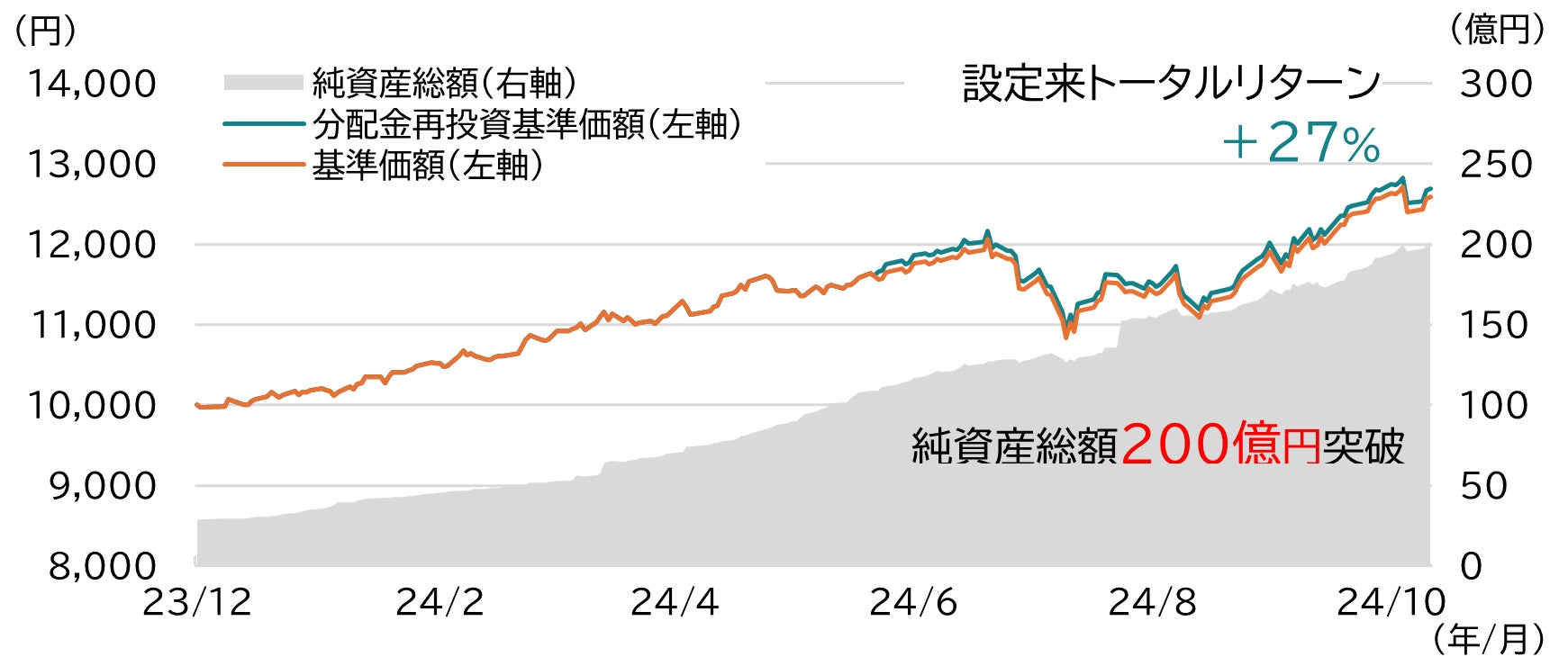 その結果、当ファンドは2024年11月7日時点で分配金お支払い後の基準価額12,588円、純資産総額201億円と好調なパフォーマンスを見せています。(2024年6月19日、分配金100円お支払い)