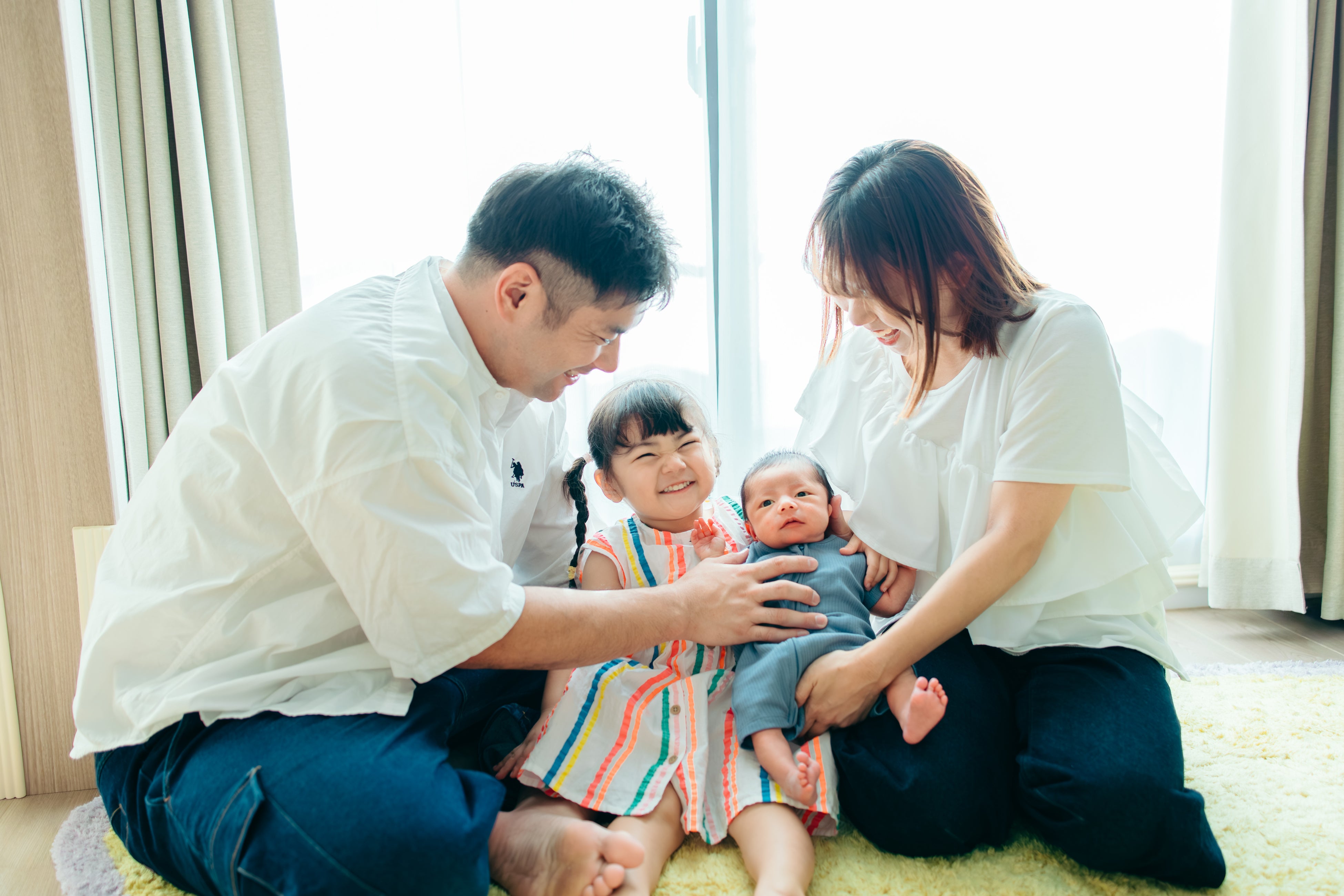 弟さんが生まれて初めてお家に帰ってきた日の記念写真。「ここがお家だよ」と誇らしげに、そして優しく伝えているお姉ちゃんの笑顔がとても印象的。新しい家族のはじまりと、あたたかな想いが感じられる素敵な作品です。