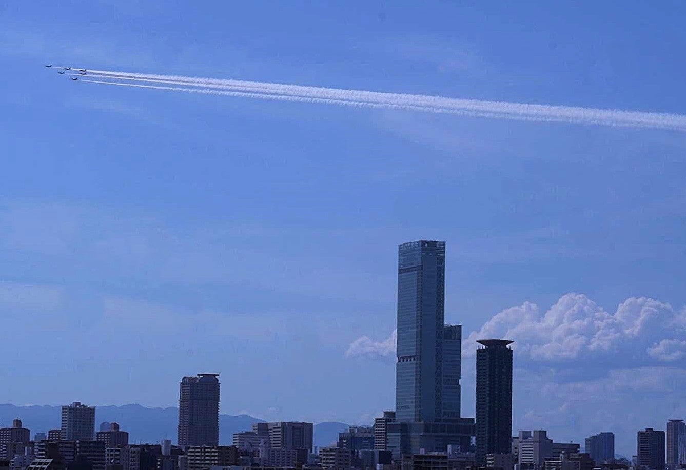 大阪のランドマーク「あべのハルカス」の上空を華麗に飛行するブルーインパルス。真っ青な空に美しい軌跡を描く姿は、「晴るかす(晴れ晴れとした気持ち)」を体現しているようで、見る人の心まで爽やかにしてくれる素晴らしい作品です。