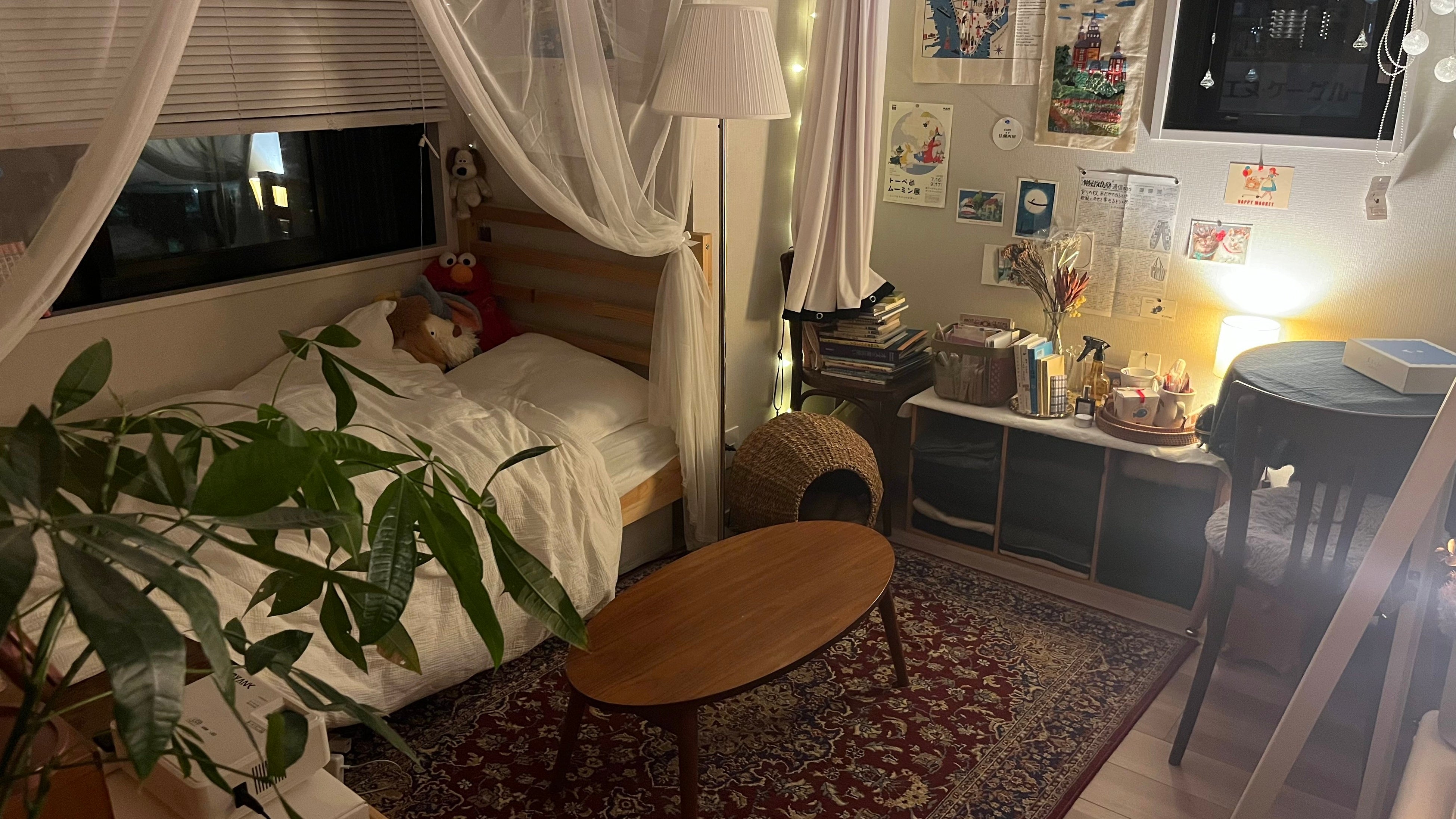 憧れのジブリ映画の世界観を再現したインテリア。複数の照明や柄物のカーペットで雰囲気を演出しつつ、ベッド横のレースが程よいアクセントとなっています。まるで物語の中に入り込んだような心地よさと、丁寧なこだわりが感じられる素敵なお部屋です。