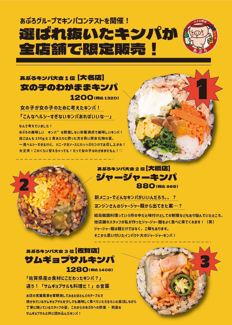 あぷろグループ全店のキンパコンテストのグランプリに輝いたキンパが恵方巻で登場!