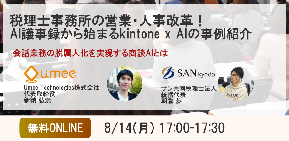 2023年8月14日(月)17:00より税理士事務所向けにAI議事録から始めるkintone×AIの事例をご紹介いたします。