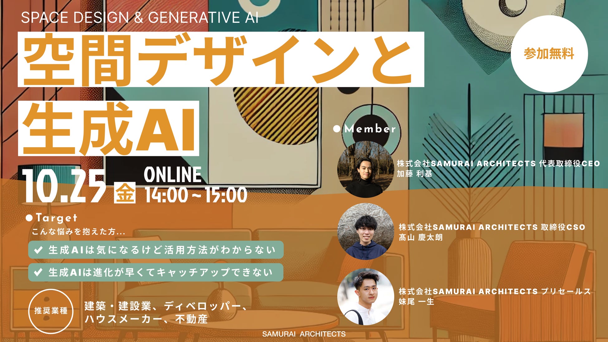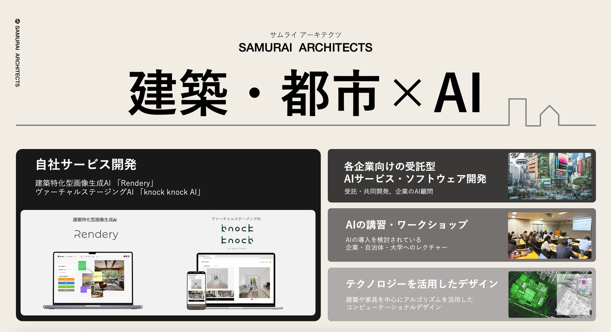株式会社SAMURAI ARCHITECTSは、「Create a Better Place with Technology」というビジョンを掲げ、建築・建設・空間デザイン領域の課題に対し、生成AIをはじめとする最先端テクノロジーを用いたソリューションを提供するスタートアップ企業です。