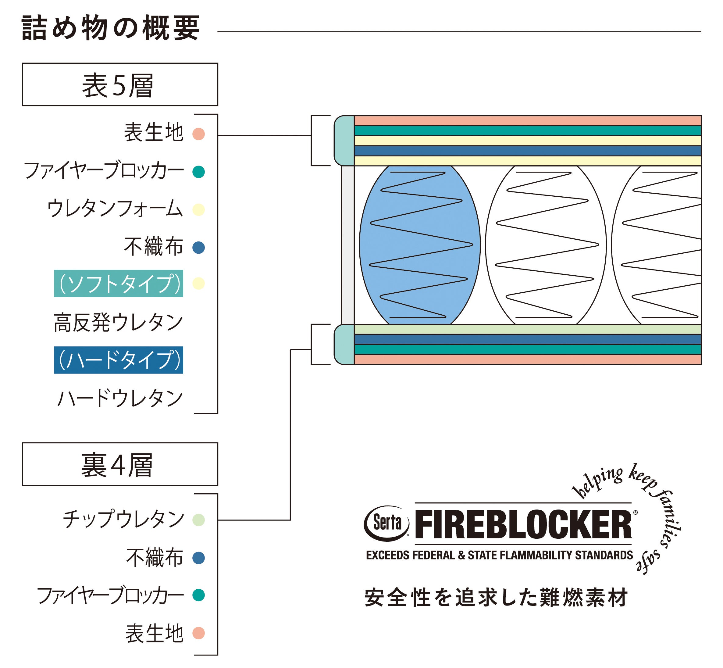 「サータPBモーション」では、並行・交互、硬さの異なる2種類の配列を用いたポケットコイルを使用。頭部と脚部は優しくふんわりとソフトに体を支え、一番荷重がかかりやすい臀部は程よい硬さでしっかりと体を支えると共に耐久性も高めています。また難燃素材であるファイヤーブロッカーを詰め物に搭載し、安全性にもこだわっています。