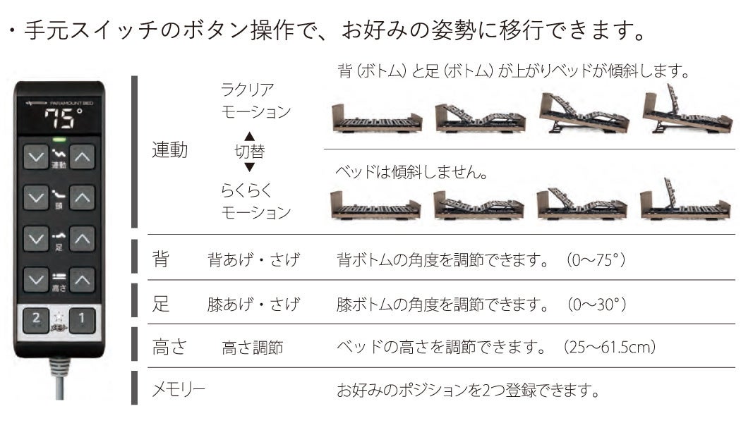 病院用電動ベッドの技術から生まれた、独自のリクライニング機構「ラクリアモーション」を搭載。背ボトムと膝ボトムの動きにベッドの傾斜を組み合わせた、パラマウントベッド独自の「ラクリアモーション」による座り姿勢は、骨盤をしっかりと起こすために安定感があり、腕や上体を動かしやすくします。さらに体圧がお尻と太ももに分散されるので、より長い時間、座ったままでも過ごしやすくなります。また、足先が下がるため、ベッドからの乗り降りもスムーズです。