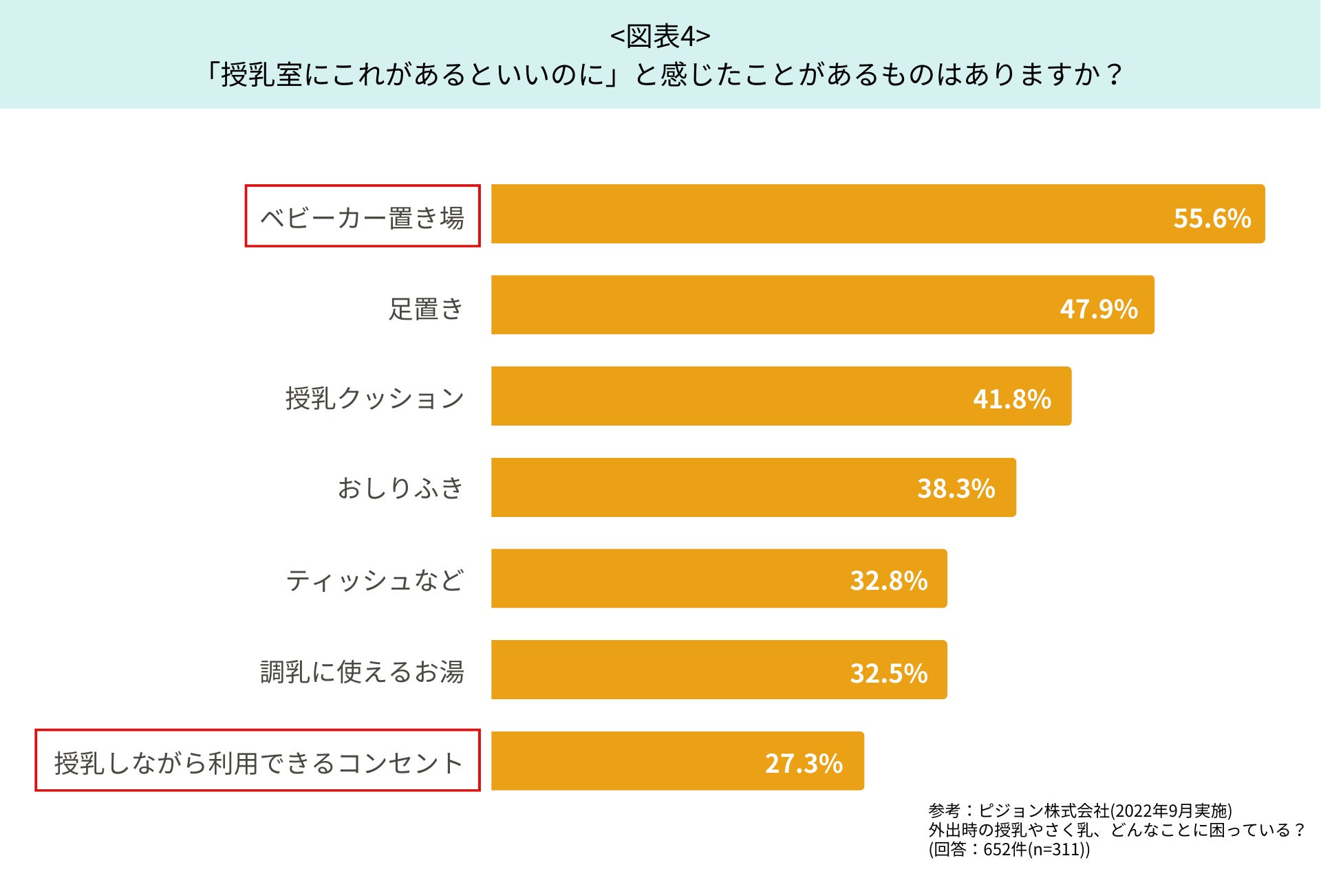 また、クッションやおしりふきなど後から追加できる備品に加えて、「ベビーカーを置けるスペース」や「授乳中に使えるコンセント」など、授乳室そのものに対する設備面での要望も多く挙がっています(図表4)。