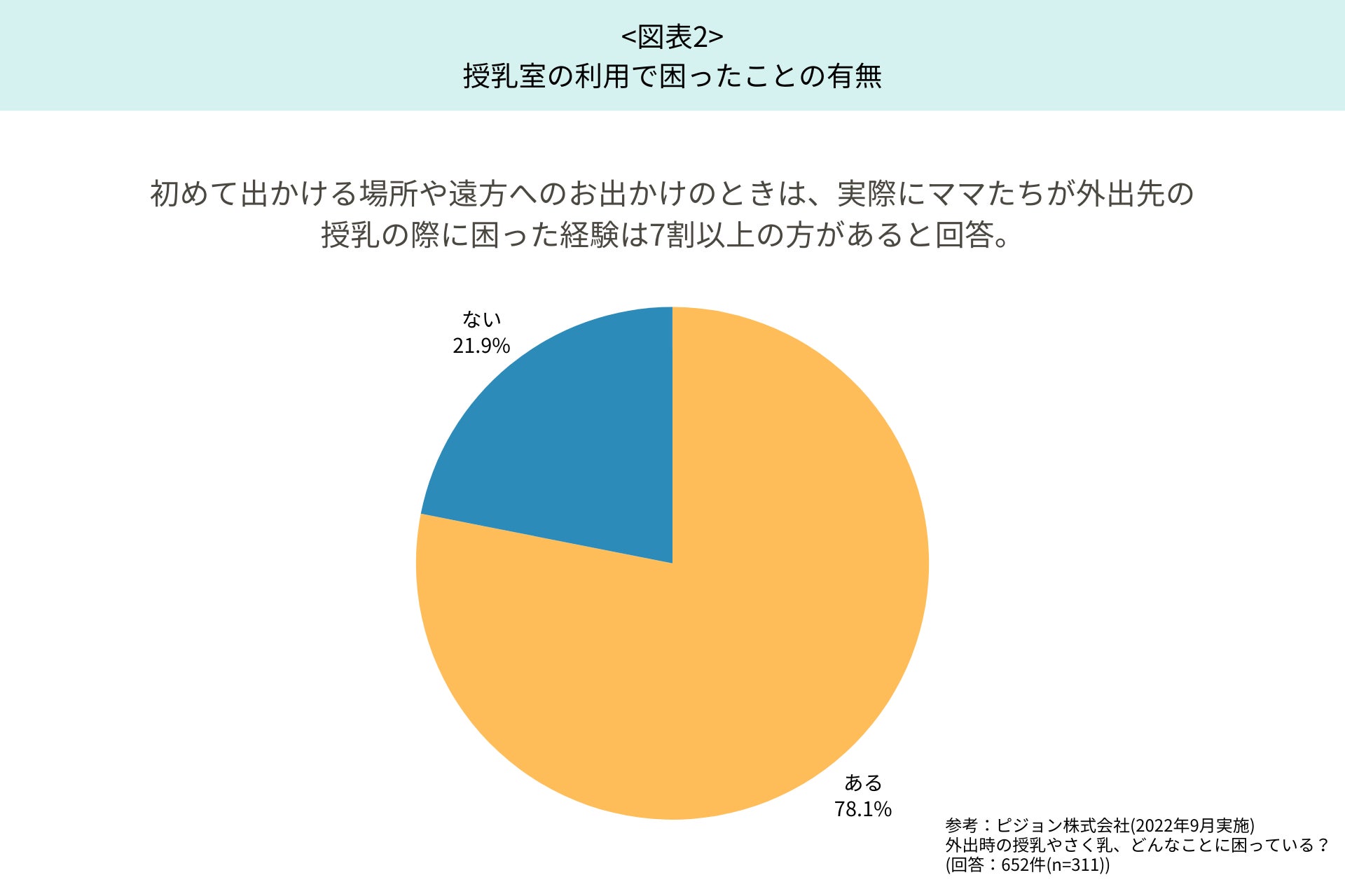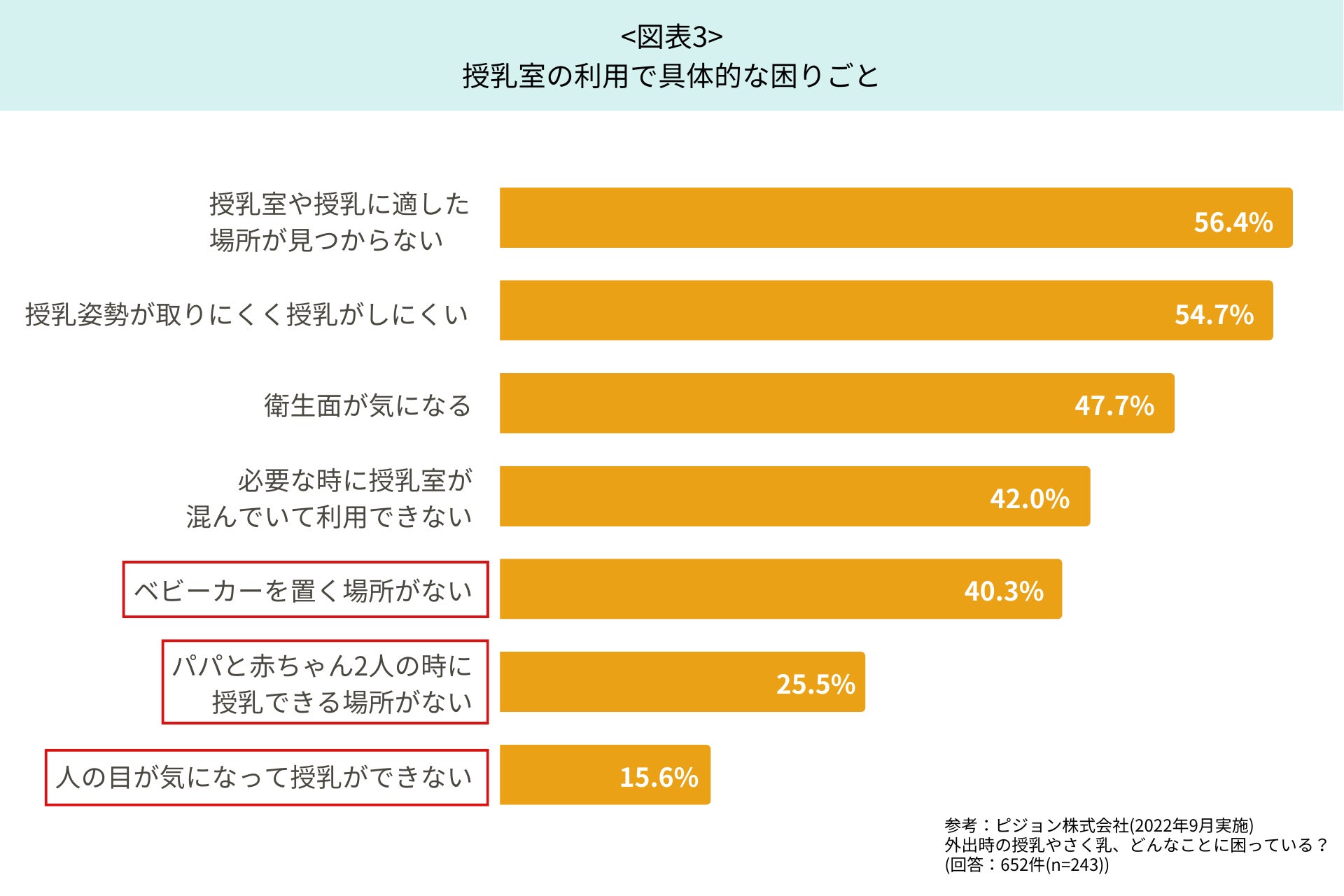 多くの自治体や施設で授乳室の整備が進んでいる一方で、約7割の方が授乳室の利用に不安や困りごとを感じた経験があると回答しています。実際には「ベビーカーを置く場所がない」「パパと赤ちゃんで利用できる場所がない」「人目が気になる」といった声が利用者から寄せられています(図表3)。
