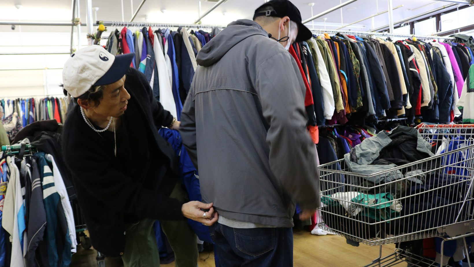 淡々とした語り口調で、古着を次から次へと手にとり、時には古着に袖を通したりしながら仕入れのポイントを解説していく光景はまさにプロフェッショナル。
